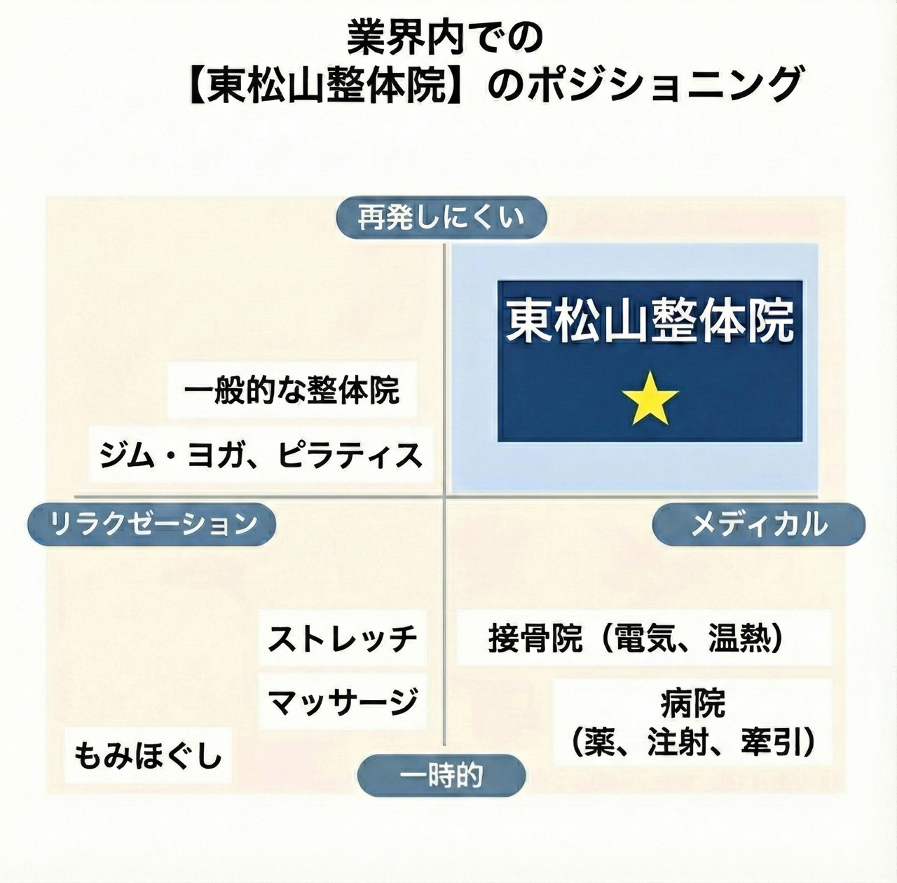 病院や大手接骨院では、毎回担当の先生が変わることがあります。また、研修スタッフやアルバイトが施術を行うことがあります。当院では、院長が責任を持ってお一人お一人対応いたします。