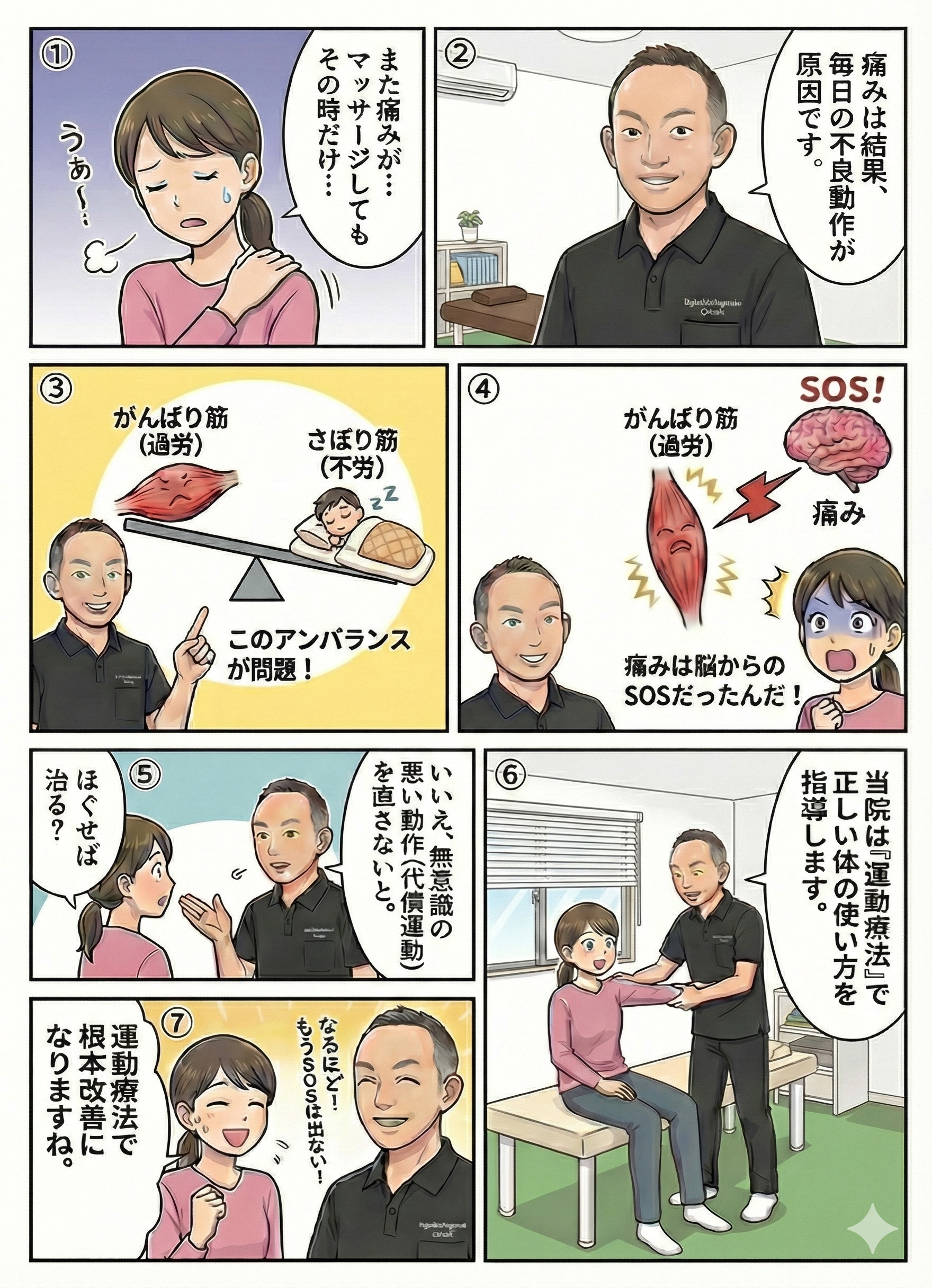 当院では、硬くなった筋肉を揉むのではなく、サボっている筋肉をピンポイントで動かす「運動療法」で、身体のバランスを根本から整えます。